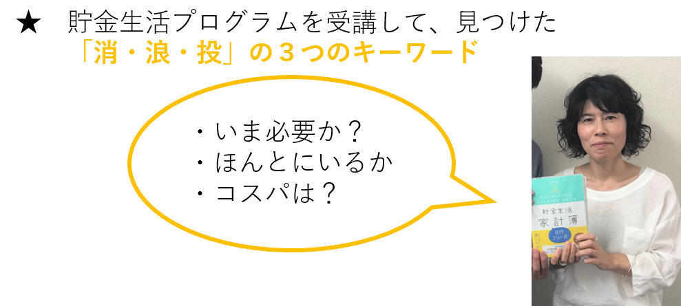 一番大きかったことは、家計簿をつけることで、「お金の使い方」が変わっていったこと。そして、横山先生が提唱する「消・浪・投」の考え方を自分なりに消化して、突き詰める作業が楽しかったです。
